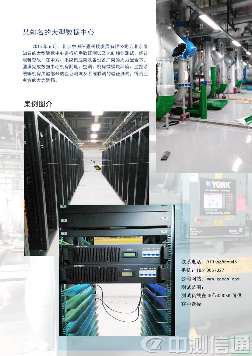 2014年12月,北京中測(cè)信通科技發(fā)展有限公司為北京某知名的大型數(shù)據(jù)中心進(jìn)行機(jī)房驗(yàn)證測(cè)試及PUE耗能測(cè)試,經(jīng)過(guò)艱苦奮戰(zhàn),在甲方、系統(tǒng)集成商及各設(shè)備廠商的大力配合下,圓滿完成數(shù)據(jù)中心機(jī)房配電、空調(diào)、機(jī)房微模塊環(huán)境、監(jiān)控系統(tǒng)等機(jī)房關(guān)鍵部分的驗(yàn)證測(cè)試及系統(tǒng)聯(lián)調(diào)的驗(yàn)證測(cè)試,得到業(yè)主方的大力贊揚(yáng)。