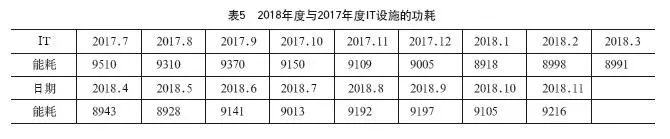 本節(jié)將對項目改造前后近兩年相同月份的空調(diào)能耗進行對比分析。我們設(shè)定上海地區(qū)每年的天氣都一樣,由此,比較了2018年度與2017年度同期的空調(diào)能耗,得出表4所示的數(shù)據(jù)。我們用2018年度的空調(diào)能耗減去2017年度的空調(diào)能耗,負值則表示2018年度低于2017年度的能耗值,正值則表示高于,表中單位為kWh。與此同時,我們監(jiān)測在此期間IT設(shè)施的功耗運行平穩(wěn)(見表5)。
