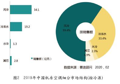 按照制冷冷源不同,機(jī)房空調(diào)可以分為風(fēng)冷型、水冷型和冷凍水型。隨著數(shù)據(jù)中心綠色節(jié)能、高密度、超大規(guī)模的發(fā)展趨勢(shì),特別是大型互聯(lián)網(wǎng)企業(yè)的新建數(shù)據(jù)中心,傳統(tǒng)風(fēng)冷型制冷技術(shù)已經(jīng)無(wú)法滿足所需的散熱能力,冷凍水型制冷系統(tǒng)在高效制冷和大制冷量方面的優(yōu)勢(shì),推動(dòng)了其較快推廣。據(jù)賽迪顧問(wèn)統(tǒng)計(jì),從市場(chǎng)需求和銷售額來(lái)看,風(fēng)冷型制冷仍是目前機(jī)房空調(diào)中的主流機(jī)型,但冷凍水型制冷呈現(xiàn)較快增長(zhǎng)趨勢(shì)。2019年,風(fēng)冷型機(jī)房空調(diào)市場(chǎng)銷售額達(dá)34.1億元,市場(chǎng)占有率為59.4%;冷凍水型機(jī)房空調(diào)市場(chǎng)銷售額達(dá)19.2億元,市場(chǎng)占有率為33.4%,見(jiàn)圖2。