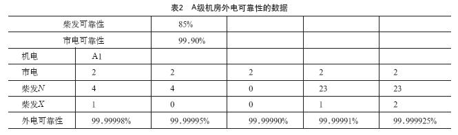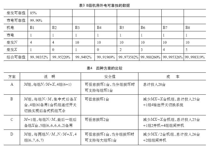 從字面上,不管N是6臺(tái)還是12臺(tái)還是18臺(tái),后備1臺(tái)都可以視為滿足規(guī)范要求;但是有朋友按照空調(diào)末端冗余N+X,N>4常規(guī)備用2臺(tái)的實(shí)踐經(jīng)驗(yàn),覺(jué)得實(shí)際末端可靠性在90%,而實(shí)際柴發(fā)可靠性也約在80%~90%之間,覺(jué)得4臺(tái)以上也應(yīng)該備用2臺(tái)。表2和表3分別給出了柴發(fā)可靠性經(jīng)驗(yàn)值為85%,市電可靠性經(jīng)驗(yàn)值為99.90%時(shí),A級(jí)機(jī)房和B級(jí)機(jī)房外電可靠性的數(shù)據(jù)。