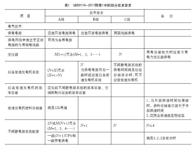 在GB50174-2017《數(shù)據(jù)中心設(shè)計(jì)規(guī)范》的附錄1《各級(jí)數(shù)據(jù)中心技術(shù)要求》的“電氣技術(shù)”中,對(duì)數(shù)據(jù)中心備用電源系統(tǒng)作出了具體的技術(shù)要求,見(jiàn)表1。