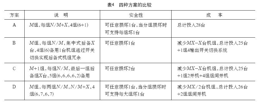 在表4中,A屬于常見(jiàn)型,D屬于有案例,B、C均只屬于理論可行,其中B屬于硬件后備式冗余,C屬于軟件后備式冗余。C的備用組也可以?xún)H設(shè)置1臺(tái)機(jī)組。當(dāng)項(xiàng)目規(guī)模較大,比如3萬(wàn)機(jī)柜,18組每組6臺(tái),可考慮設(shè)置一組備用6臺(tái),直接進(jìn)行負(fù)載切換,而不需要組間并機(jī),可以視為C的一種變型。