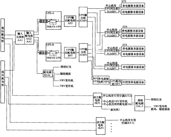 機房配電還應(yīng)考慮系統(tǒng)的擴展、升級等可能性,并應(yīng)預(yù)留備用容量。單相負荷應(yīng)均勻地分配在三相線路上,并使三相負荷不平衡度小于20%。