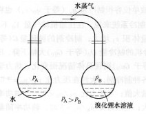 吸收式制冷機內(nèi)采用的工質(zhì)是由低沸點物質(zhì)和高沸點物質(zhì)組成的工質(zhì)對。其中低沸點物質(zhì)作為制冷劑,高沸點物質(zhì)作為吸收劑。在氨水溶液吸收式制冷機中,氨為制冷劑,水為吸收劑。在溴化鋰水溶液吸收式制冷機中,水為制冷劑,溴化鋰為吸收劑。目前廣泛使用的是溴化鋰水溶液吸收式制冷機。溴化鋰的沸點很高(1265℃),在鎳化鋰水溶液上方的蒸氣幾乎全部為水蒸氣,而溴化鋰溶液中的浪化錘分子對水分子的吸引作用很強,使溶液上方水蒸氣的飽和壓力較之同溫度下水的飽和蒸汽壓力低得很多。由于溴化鋰溶液和水之間存在蒸汽壓力差,溴化鋰溶液即吸收水的蒸汽,如圖1所示。水則進一步蒸發(fā)吸收熱量,使本身溫度降低到對應(yīng)的較低壓力的蒸發(fā)溫度從而實現(xiàn)制冷目的。