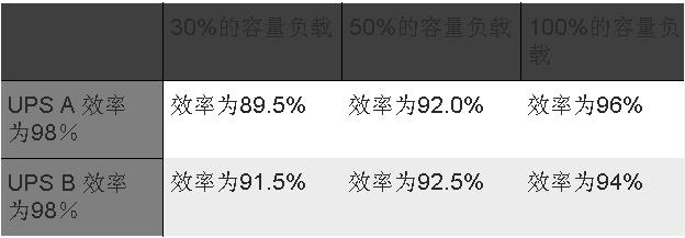 當在對比選擇決定兩款UPS中的哪款更更有效時,滿負載容量情況下,效率為96%的UPS A將是合乎邏輯的選擇;但當在不同的操作容量能力情況下進行對比時(如下表2),結(jié)果便出現(xiàn)了大反轉(zhuǎn)。在容量能力低于50%的情況下,“效率較低”的UPS的實際效率要比效率為96%的UPS更高效。