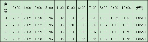 在多種容量測試方案的選擇上,受資金和設(shè)備的制約,實際工作中更多采用在線容量測試,由于后端負(fù)載穩(wěn)定,以恒電流放電,根據(jù)放電電流的大小,又分為10小時率放電測試,3小時率放電測試等。因為本項目中電池放電電流在100A左右,并對應(yīng)電池廠家提供的(蓄電池恒電流表/恒功率表)查得,此電池的10小時率放電電流為108.5A,故實際電流滿足測試要求。