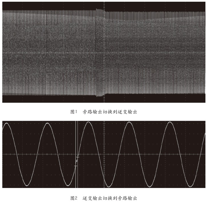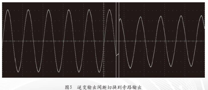 圖1為在線式UPS從旁路輸出切換到逆變輸出的波形圖?梢詮膱D中看到,由于旁路市電的電壓比逆變器設(shè)定的電壓稍高,所以在切換前逆變器升高了輸出電壓,使輸出電壓與旁路電壓相同或者略高于旁路電壓,這樣可以防止市電向逆變器反灌電流而對(duì)逆變器產(chǎn)生損壞。此時(shí)旁路輸出和逆變輸出均已開(kāi)啟,并同時(shí)向負(fù)載供電。一段時(shí)間后,旁路輸出關(guān)閉,逆變器調(diào)整輸出電壓下降至UPS的設(shè)定值,逆變器正常輸出,UPS完成旁路輸出到逆變輸出的切換。