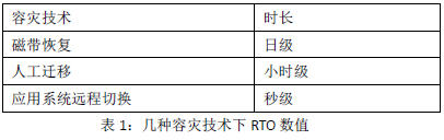RTO(RecoveryTimeObjective,復(fù)原時(shí)間目標(biāo))是數(shù)據(jù)中心可容許服務(wù)中斷的時(shí)間長(zhǎng)度。比如說服務(wù)發(fā)生后半天內(nèi)便需要恢復(fù),RTO數(shù)值就是十二小時(shí)。RTO具體時(shí)間長(zhǎng)短只是從故障發(fā)生后,從數(shù)據(jù)中心系統(tǒng)宕機(jī)導(dǎo)致應(yīng)用停頓之刻開始,到數(shù)據(jù)中心系統(tǒng)恢復(fù)至可以支持各部門運(yùn)作之時(shí),此兩點(diǎn)之間的時(shí)間段。RTO是反映數(shù)據(jù)中心業(yè)務(wù)恢復(fù)的及時(shí)性指標(biāo),表示業(yè)務(wù)從中斷到恢復(fù)正常所需的時(shí)間,RTO數(shù)值越小,代表容災(zāi)系統(tǒng)的數(shù)據(jù)恢復(fù)能力越強(qiáng),數(shù)據(jù)中心可以部署很多容災(zāi)系統(tǒng),來獲取最小的RTO,但這意味著投入大量資金。提升RTO的常用技術(shù)有:磁帶恢復(fù)、人工遷移、應(yīng)用系統(tǒng)遠(yuǎn)程切換,這幾種技術(shù)的RTO的表現(xiàn)如表1所示: