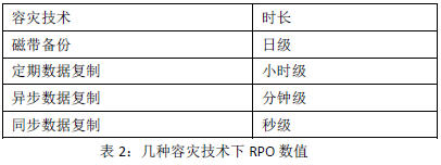 RPO(RecoveryPointObjective,復(fù)原點(diǎn)目標(biāo))是指數(shù)據(jù)中心能容忍的最大數(shù)據(jù)丟失量,是指當(dāng)業(yè)務(wù)恢復(fù)后,恢復(fù)得來的數(shù)據(jù)所對(duì)應(yīng)時(shí)間點(diǎn),RPO取決于數(shù)據(jù)中心數(shù)據(jù)恢復(fù)到怎樣的更新程度,這種更新程度可以是上一周的備份數(shù)據(jù),也可以是昨天的數(shù)據(jù),這和數(shù)據(jù)備份的頻率有關(guān),為了改進(jìn)RPO,必然要增加數(shù)據(jù)備份的頻率才行。RPO是反映數(shù)據(jù)中心恢復(fù)數(shù)據(jù)完整性的指標(biāo)。在同步數(shù)據(jù)復(fù)制方式下,RPO等于數(shù)據(jù)傳輸時(shí)延的時(shí)間,在異步數(shù)據(jù)復(fù)制方式下,RPO基本為異步傳輸數(shù)據(jù)排隊(duì)的時(shí)間。提升RPO的常用技術(shù)有:磁帶備份、定期數(shù)據(jù)復(fù)制、異步數(shù)據(jù)復(fù)制、同步數(shù)據(jù)復(fù)制等,這幾種技術(shù)的RPO的表現(xiàn)如表2所示: