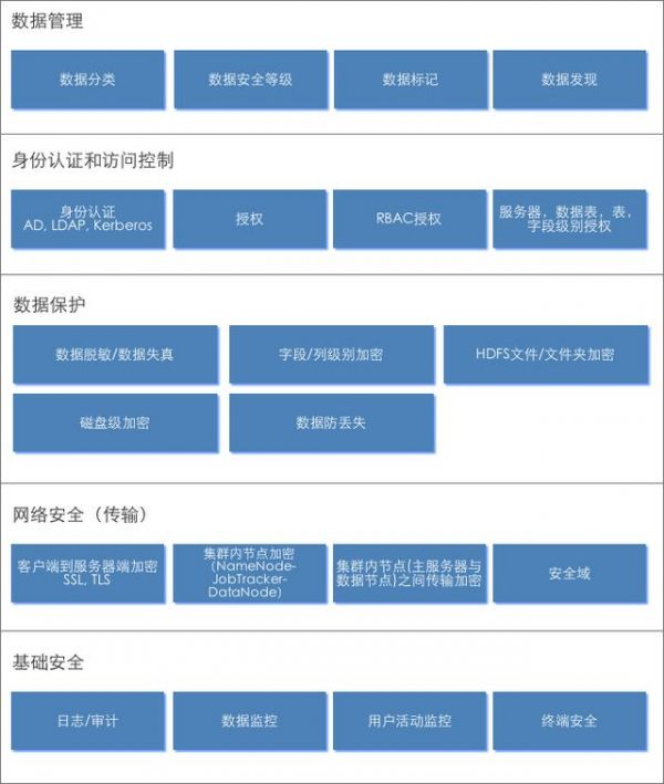 基于以上四層的安全體系,結(jié)合大數(shù)據(jù)平臺(tái)的特性,企業(yè)在實(shí)踐大數(shù)據(jù)平臺(tái)安全化時(shí),需要有更詳細(xì)的架構(gòu)設(shè)計(jì),四層安全體系對(duì)應(yīng)在實(shí)際環(huán)境中,應(yīng)是以數(shù)據(jù)為中心,建立完善的管理制度,先治理好大數(shù)據(jù),再從訪問控制和數(shù)據(jù)保護(hù)層面加強(qiáng)對(duì)數(shù)據(jù)使用的安全防護(hù),最后從網(wǎng)絡(luò)和基礎(chǔ)層加固平臺(tái)的安全部署。因此,大數(shù)據(jù)安全框架需包含以下5個(gè)核心模塊: 數(shù)據(jù)管理、身份和訪問管理、數(shù)據(jù)保護(hù)、網(wǎng)絡(luò)安全、基礎(chǔ)安全。