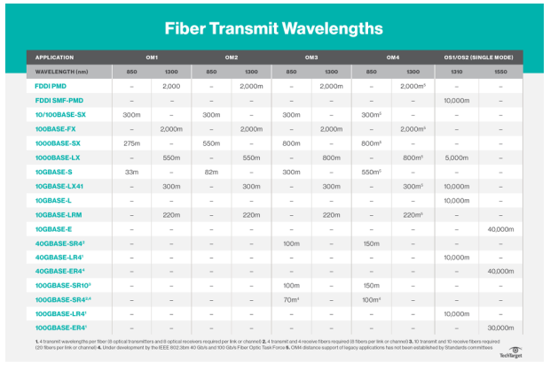 光纖傳輸速率取決于光纖的距離、直徑以及用于在光纖上遷移光的光源。單模光纖被設(shè)計(jì)用于長距離的應(yīng)用程序,而多模光纖通常用于較短的上行鏈路,服務(wù)器到交換機(jī)和骨干應(yīng)用程序。公布的標(biāo)準(zhǔn)所支持的距離如下。