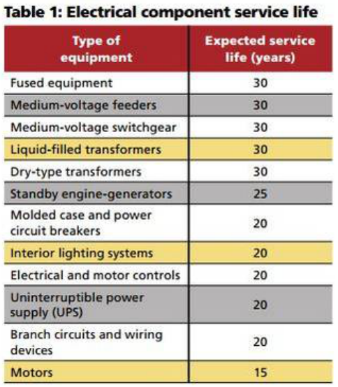 如維護保養(yǎng)得當(dāng),建筑中商業(yè)級配電系統(tǒng)的使用年限通常在20至30年,配電組件使用年限如下表: