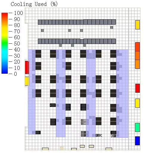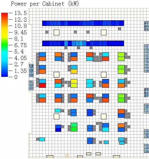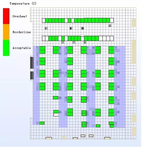 模擬結(jié)果:所有機柜最高進風(fēng)溫度滿足要求,沒有機柜處于過熱或臨近過熱狀態(tài)。