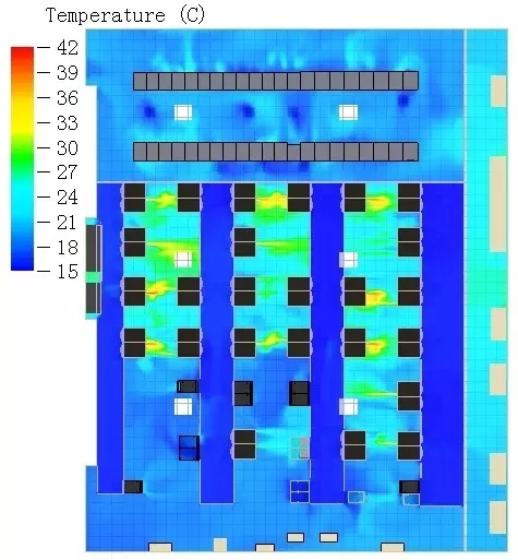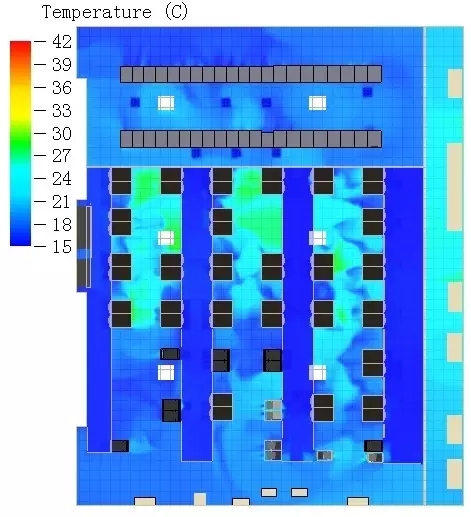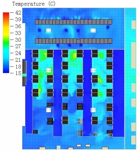 運算完成后,輸出各種結(jié)果,包括任意平面的溫度場云圖(通常選取三個高度的水平面溫度場云圖)、空調(diào)氣流流線圖(包括送風(fēng)、回風(fēng)氣流流線圖)、各空調(diào)利用率、各機柜過熱狀況示意圖、機房熱負荷分布圖等。
