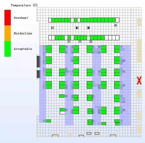 模擬利用率最高的空調(diào),在備用停機或故障(整機故障或制冷故障)時,機房的溫度場情況,以及各機柜的過熱情況。如圖2-11是模擬做了冷通道封閉后,一臺空調(diào)停機或整機故障情況下,各機柜的過熱情況。從模擬結(jié)果看,各機柜均沒有過熱情況出現(xiàn)。