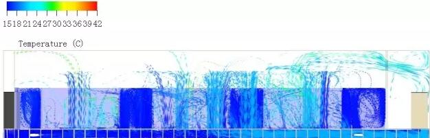 從上面的送風(fēng)氣流圖(不顯示機柜)可見,在進行了冷通道封閉后,空調(diào)送風(fēng)大部分在冷通道內(nèi),部分通過機柜底部的孔洞進入機柜,而不是短路回到空調(diào)、或竄氣到熱通道。這樣空調(diào)送風(fēng)的利用效率得以提高。