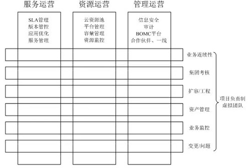 考慮到資源池初始階段還有很多傳統(tǒng)架構(gòu)和云架構(gòu)并存,且資源池需要提前建設(shè),上述劃分僅適應(yīng)運營階段需要,我們在運營團隊中橫向構(gòu)建了跨專業(yè)的虛擬團隊,作為項目小組,人員跨資源運營和服務(wù)運營的成員組成,例如擴容項目組、工程項目組、業(yè)務(wù)連續(xù)性項目組等,作為臨時需要時的一個扁平化團隊,如下圖所示: