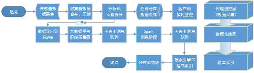 利用大數(shù)據(jù)集中處理平臺的處理流程主要分兩部分,通過消息隊列處理Flume采集的日志,再通過ElasticSearch建立索引,最終將數(shù)據(jù)、索引導入在mysql集群。如下: