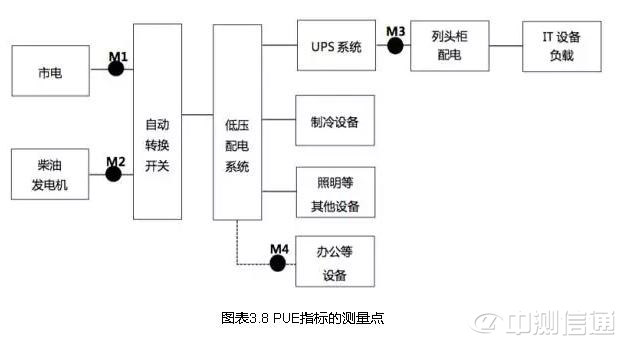 在正常情況下,數(shù)據中心的電能由市電提供,測量點應取市電輸入變壓器之前,即圖3.8中的M1 點。當市電故障情況下,柴油發(fā)電機產生的電力(圖3.8中的M2點〉作為數(shù)據中心總耗電的測量點。如果是多用途機房樓,數(shù)據中心總耗電計算中,需減去在M4點測量的辦公等其他耗電。