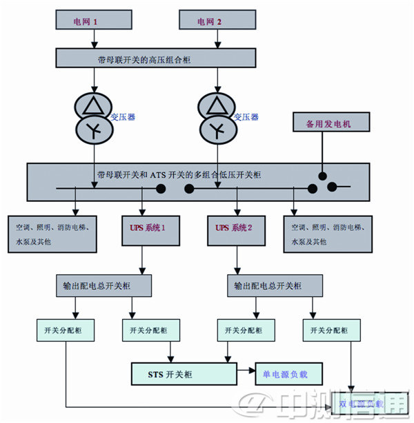 雙總線供電方式是采用兩條總線對后端設(shè)備進行供電,每條總線上具有相同的一套UPS供電方式。消除可能出現(xiàn)在UPS輸出端與最終用戶負載端之間的“單點瓶頸”故障隱患,以提高輸出電源供電系統(tǒng)的“容錯”功能。此供電方式能夠在線維護、在線擴容、在線升級,提高了重要總線的可用性,滿足了雙電源用電設(shè)備的需求,真正實現(xiàn)了7×24×365小時運行的目標。但是雙總線冗余供電方式相當(dāng)于搭建了兩套前述供電方式的回路,需要增加2倍以上的成本。
