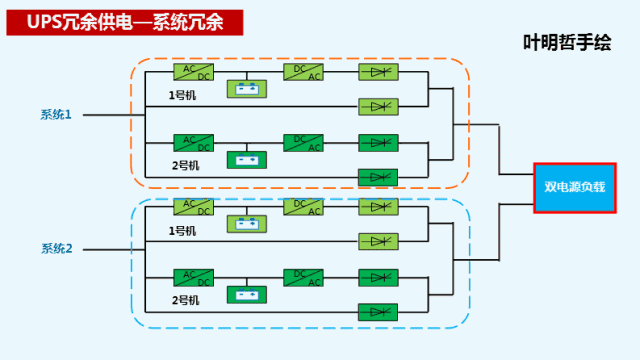 常見(jiàn)的是雙總線系統(tǒng),系統(tǒng)內(nèi)部設(shè)備獨(dú)立,配電系統(tǒng)獨(dú)立,是目前業(yè)內(nèi)公認(rèn)的最可靠及可行的工作方式,冗余方式發(fā)揮作用前提是負(fù)載設(shè)備配備雙電源模塊,且兩個(gè)電源模塊式負(fù)載分擔(dān)模式工作,該方法也被普遍采用。