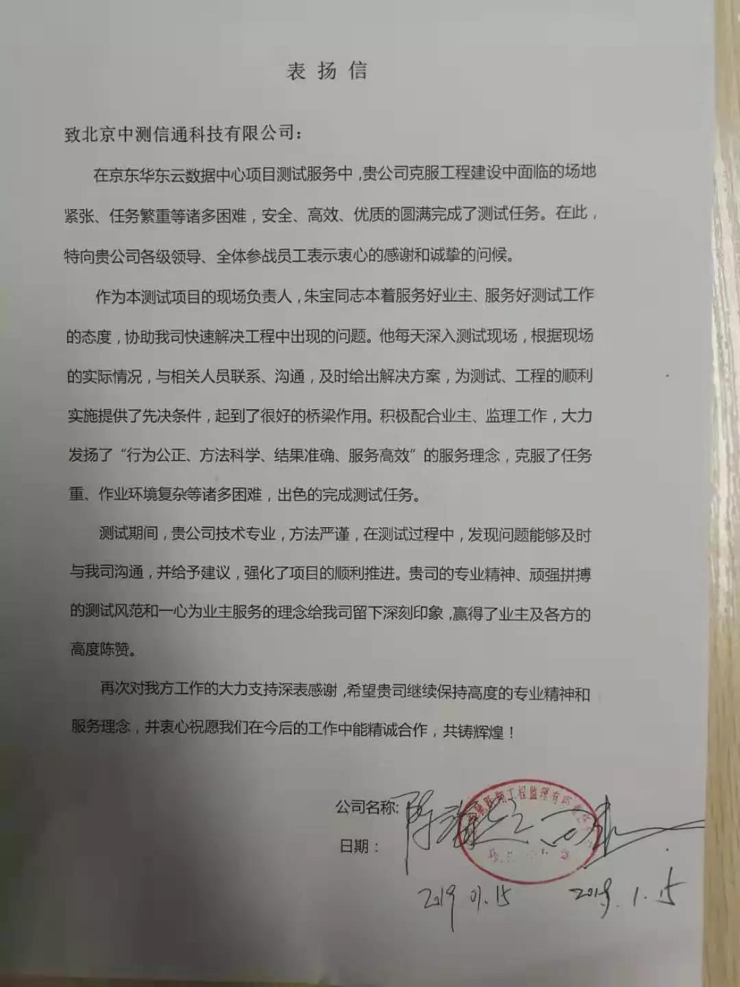此次測(cè)試工作圓滿完成,業(yè)主方贊不絕口,并提出書面表?yè)P(yáng)!