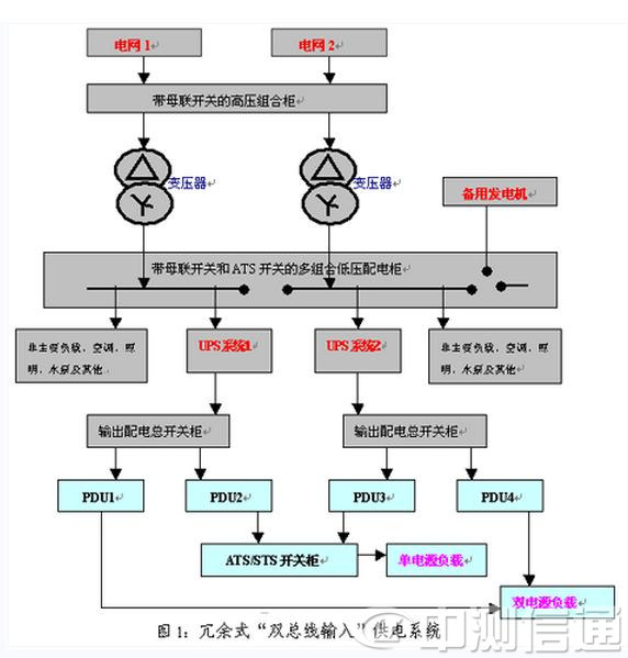 全集中模式下,計算機系統(tǒng)是由計算機及網(wǎng)絡等電子設(shè)備組成,這些電子設(shè)備對電源系統(tǒng)有著嚴格的技術(shù)標準和要求。UPS供電系統(tǒng),通常是指UPS主機、蓄電池、靜態(tài)旁路開關(guān)及其他接入接出輔助設(shè)備和環(huán)節(jié)組成,要讓網(wǎng)絡數(shù)據(jù)中心機房真正具備365×24h連續(xù)不斷運行,僅靠工作效率高、輸出能力強的UPS本身無法達到,UPS系統(tǒng)中的輸入輸出配電柜、并機柜、斷路器開關(guān)和傳輸電纜等輔助設(shè)備都是單點故障瓶頸,一旦出現(xiàn)問題,就必然造成系統(tǒng)停電故障,因此要實現(xiàn)接近零故障的供電,必須是一個有高度容錯功能的冗余供電系統(tǒng),F(xiàn)代IDC機房供電系統(tǒng)的硬件配置示意如圖1所示。一般是由2路/多路市電源組成冗余式市電系統(tǒng)+備用發(fā)電機組+1臺/多臺自動切換開關(guān)(ATS: Automatic Transfer Switch)+防雷擊抗瞬態(tài)浪涌抑制器和UPS供電系統(tǒng)來共同組成。這基本上是一個“永遠不會停電”的配電系統(tǒng),允許執(zhí)行“不停電”的維護和檢修操作,可將其可用性提高到99.999%,每年網(wǎng)絡機房停機時間低于5.26分鐘。