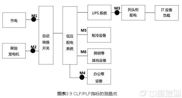 在正常情況下,數(shù)據中心的電能由市電提供,測量點應取市電輸入變壓器之前,即圖3.8中的M1 點。當市電故障情況下,柴油發(fā)電機產生的電力(圖3.8中的M2點〉作為數(shù)據中心總耗電的測量點。如果是多用途機房樓,數(shù)據中心總耗電計算中,需減去在M4點測量的辦公等其他耗電。